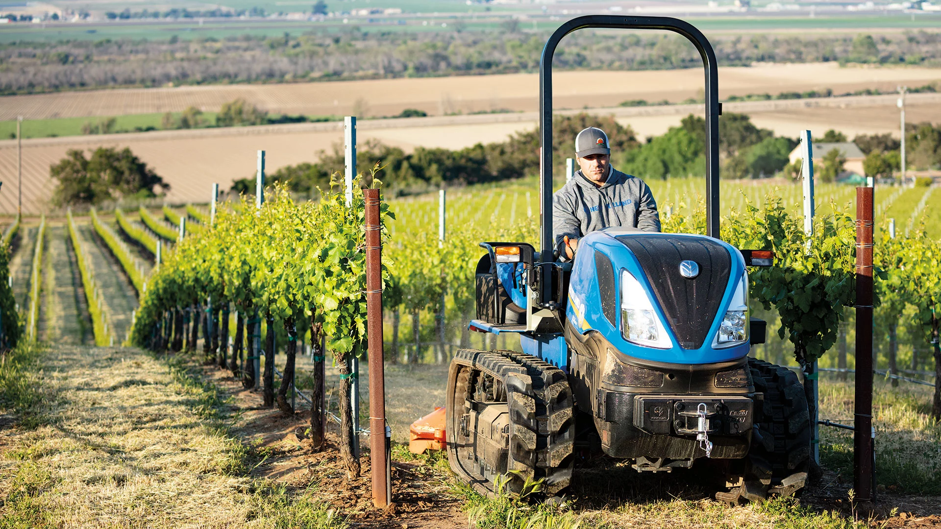 The TK4 series of crawler tractors combines the best of New Holland’s comfort and performance features with unmatched stability thanks to the track design and low center of gravity. Powered by new FPT F5C engines, these tractors help operators in vineyards and orchards work efficiently, comfortably, and, most importantly, safely.